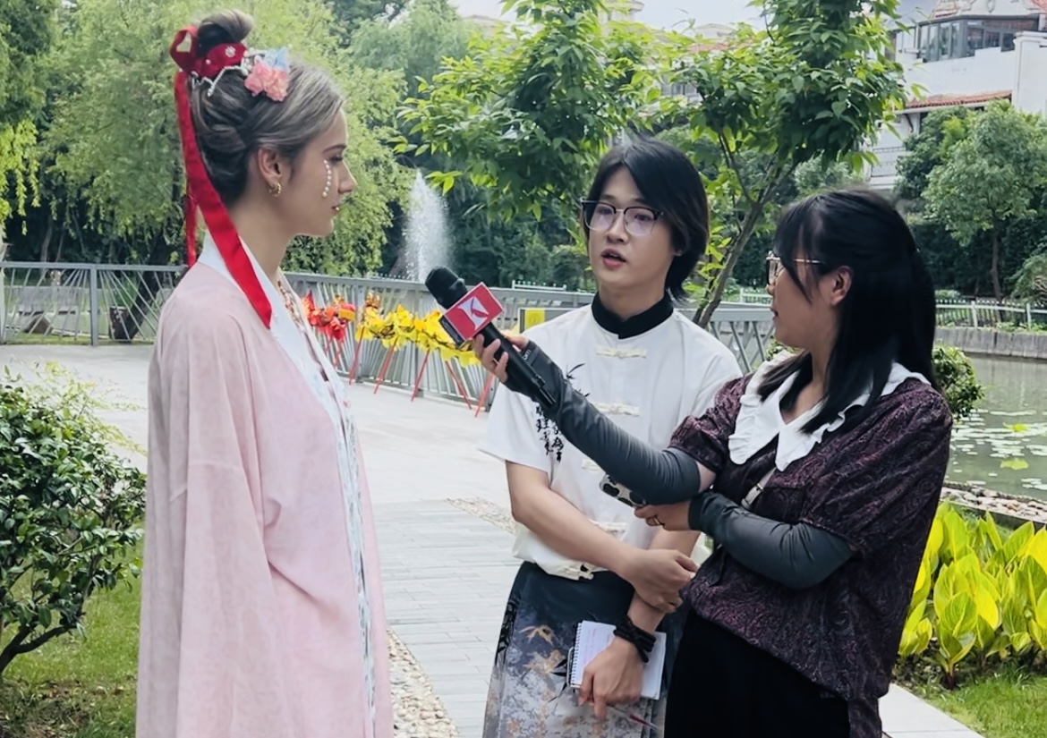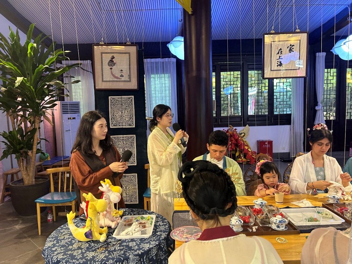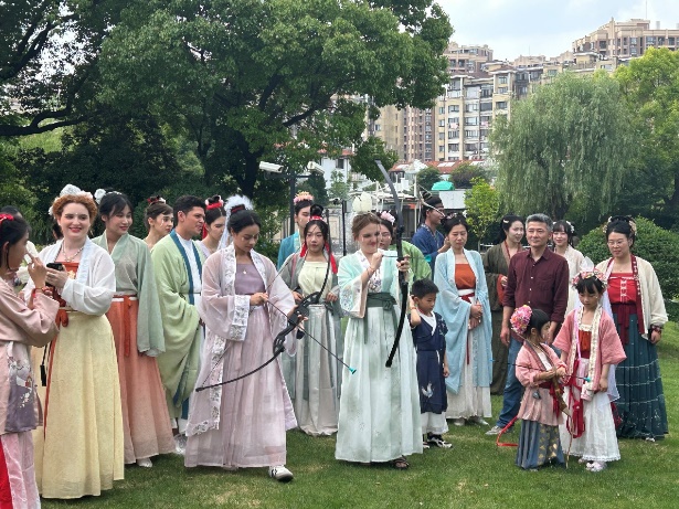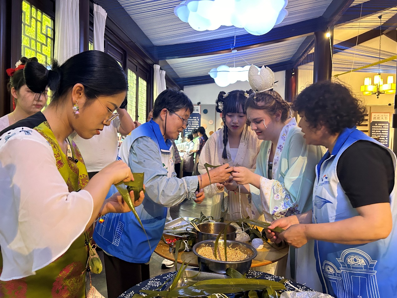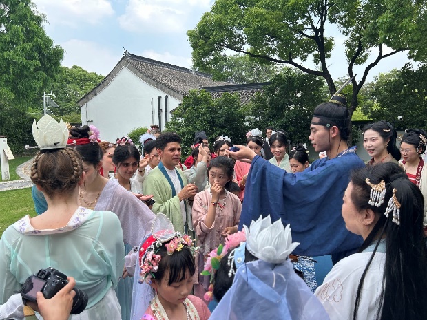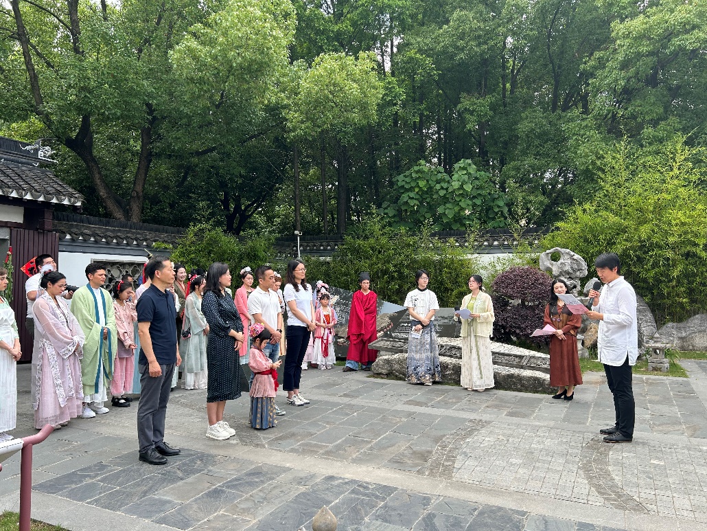 6月8日端午假期首日,600cc全讯白菜自助注册来自俄罗斯、土耳其、哈萨克斯坦等8国的留学生身着宋制汉服,于徐汇区黄道婆纪念公园沉浸式游园,共同体验了端午民俗活动和传统非遗活动,2023白菜网址官网大全英语系志愿者全程为外国友人口译,积极参与了中国传统文化的国际传播实践。